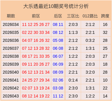 上期大乐透的开奖号码中,三区比为2:3:0,012路比为1:2:2,前区奖号跨度为14。